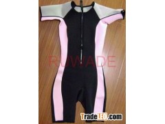 Spec–Shorty wetsuit style,2.5mm-3.5mm neoprene with nylon fabric outside,nylon/long terry fabric inside,flat stitch,back resin zipper,silk screen printed logo